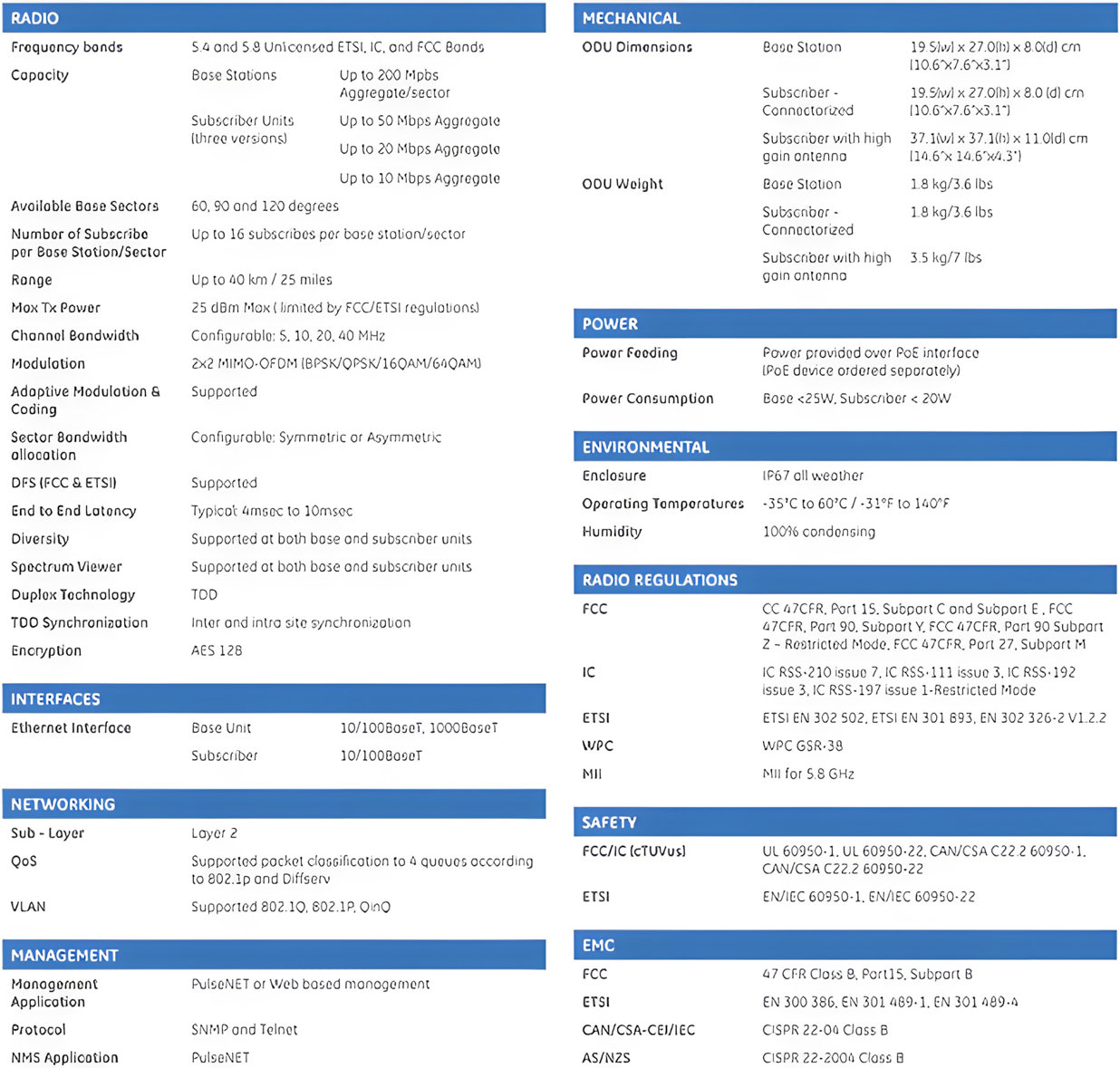 - Point-to-multi-point communications infrastructure with high base station capacity (up to 200 Mbps aggregate) and multiple subscribers (up to 32) within a coverage sector