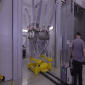 An employee stands in front of a circuit breaker manufactured at GE Vernova's Grid Solutions manufacturing facility in Charleroi, PA.