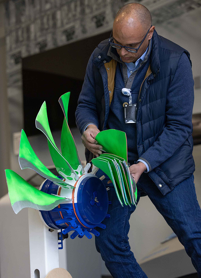 For the past decade, he’s led engineering teams at GE Aerospace’s headquarters in Evendale, Ohio. After heading the development of a streamlined fuel efficiency system for the LEAP-1B* engine, among other contributions, he designed the GE9X turbofan’s cyclonic inducer, a 3D-printed labyrinth of metal airflow channels that funnels dust out of the engine using centrifugal force. Of his seven-and-counting patents, that’s his favorite. “It was a pinch-me moment, designing a new-to-the-world part with a cutting-edge technology.”