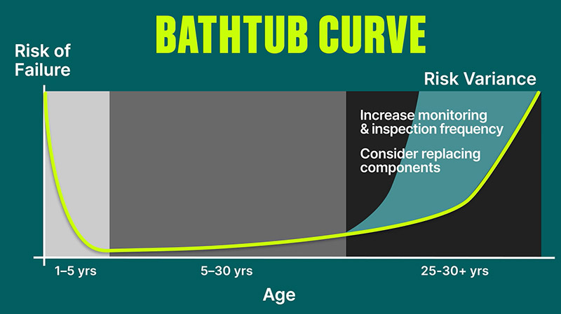 The bathtub curve—a long-standing illustration of probability modeling—spotlights the ways risks of failure can increase exponentially, especially with equipment like a generator late in its life cycle.